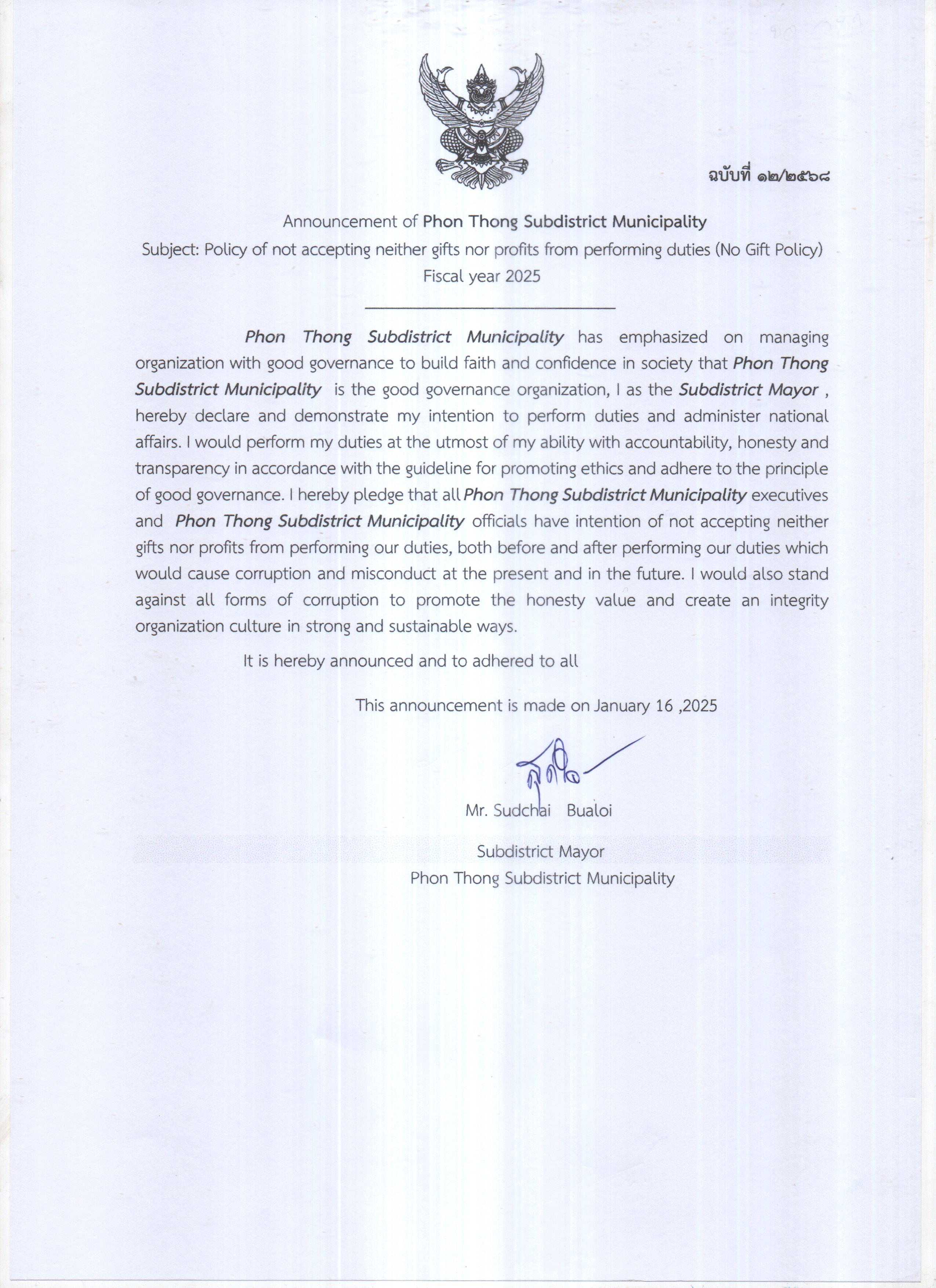 ประกาศเทศบาลตำบลโพนทอง เรื่องนโยบายการไม่รับของขวัญ (ภาษาอังกฤษ) |
